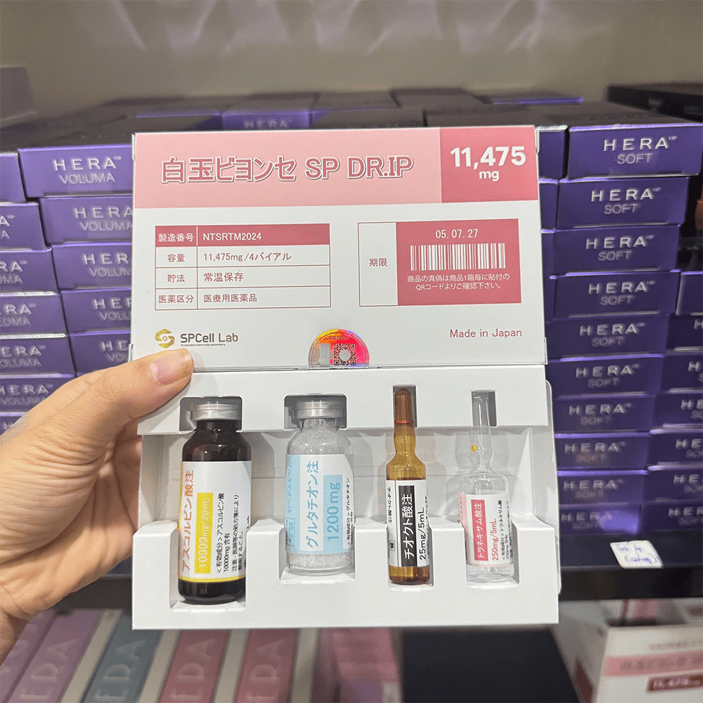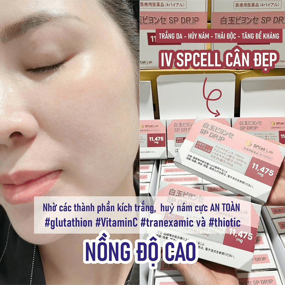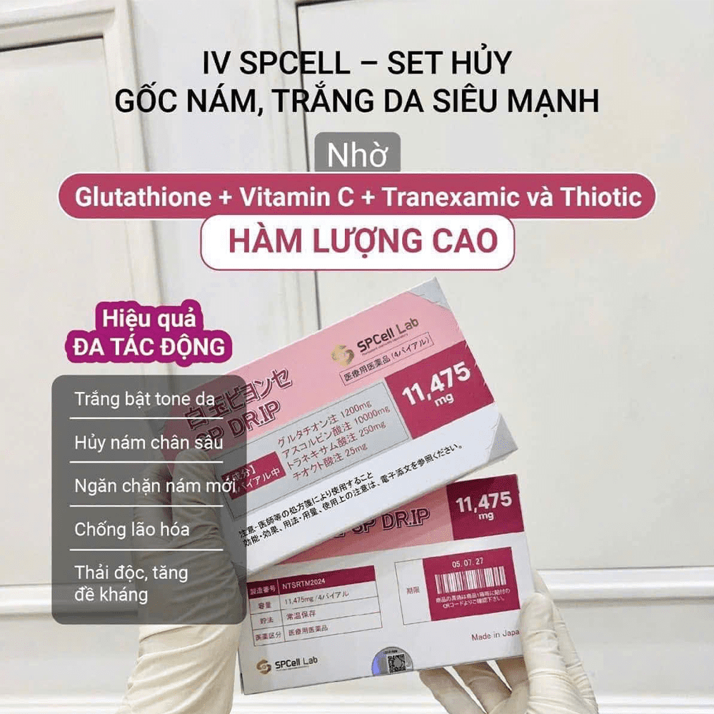 SPCell Lab SPCell IV DR.IP 11475 mg là bộ sản phẩm truyền dưỡng chất làm trắng da và hỗ trợ giảm nám, sạm màu chuyên sâu được phát triển bởi SPCell Lab (Nhật Bản). Sản phẩm được thiết kế để tác động từ bên trong cơ thể qua đường truyền tĩnh mạch (IV drip), hỗ trợ giảm sắc tố da, làm sáng da bật tone và cải thiện sắc tố không đều một cách toàn diện. Đây là giải pháp thường được sử dụng trong các liệu trình làm đẹp chuyên sâu tại spa/clinic dưới sự giám sát của chuyên gia y tế có kinh nghiệm.